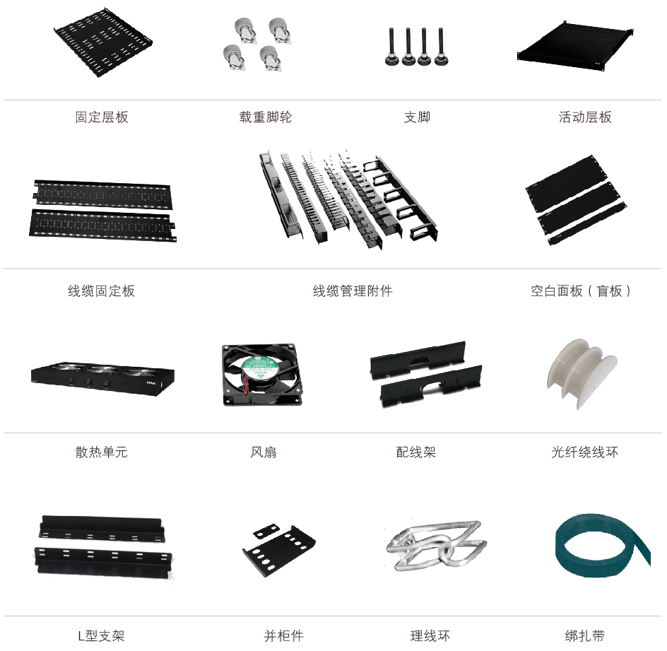 科士达提供固定层板、载重脚轮、支脚、活动层板、线缆固定板、线缆管理附件、空白面板(盲板)、散热单元、风扇、配线架、光纤绕线环、L型支架、并柜件、理线环、绑扎带机柜配件。
